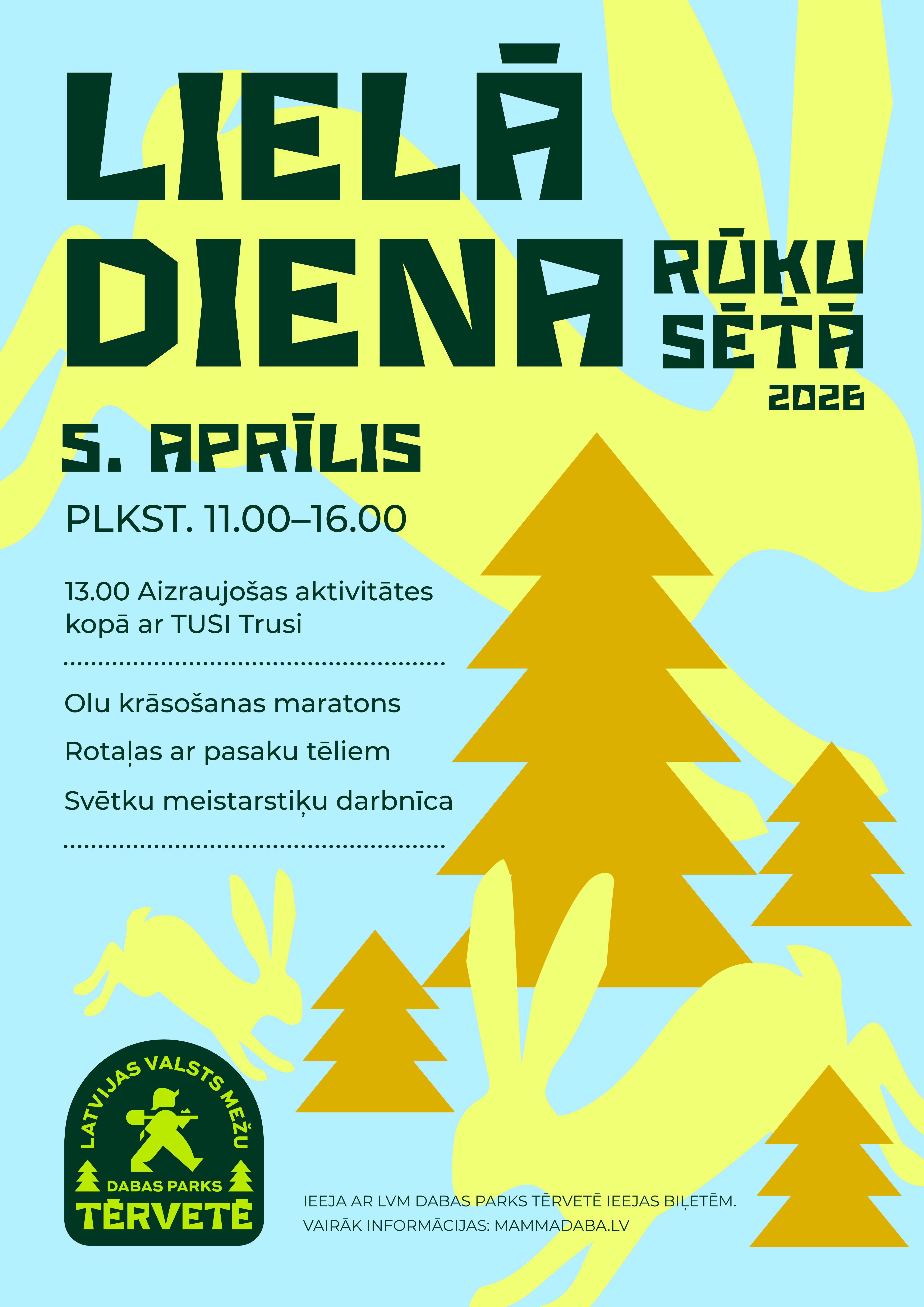 Latvijas valsts mežu dabas parka Tērvetē meža takās apmeklētājus sagaidīs svētku simbols - Lieldienu Zaķis, kurš aicinās piedalīties olu ripināšanas un kaulēšanās aktivitātēs. Rūķu sētā pasaku tēli aicinās iesaistīties tematiskās rotaļās un izgatavot savu Lieldienu meistarstiķi. Pl. 13.00 ciemos ieradīsies īpašs viesis - TUSIS Trusis - ar aizraujošām aktivitātēm kā lieliem, tā maziem.