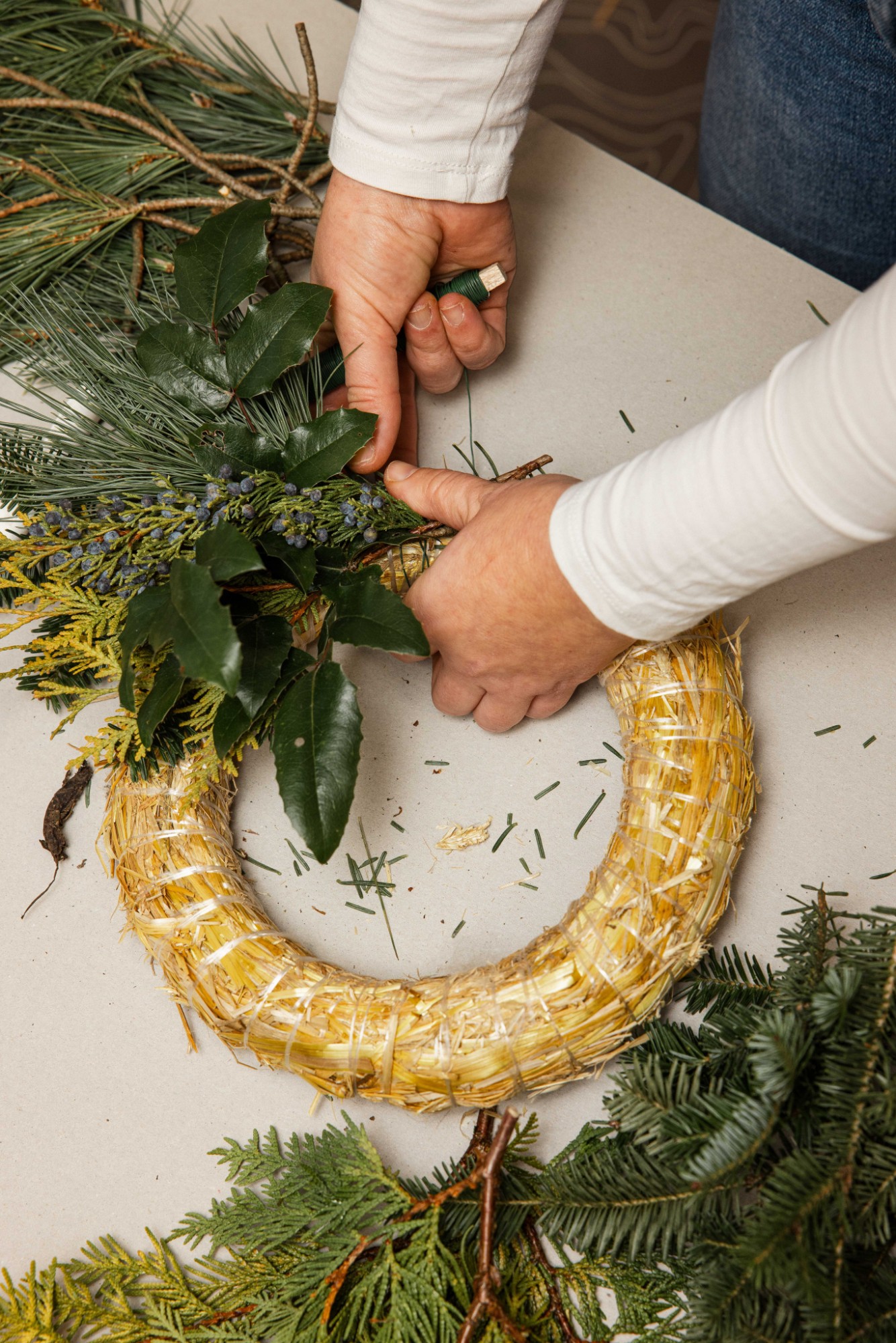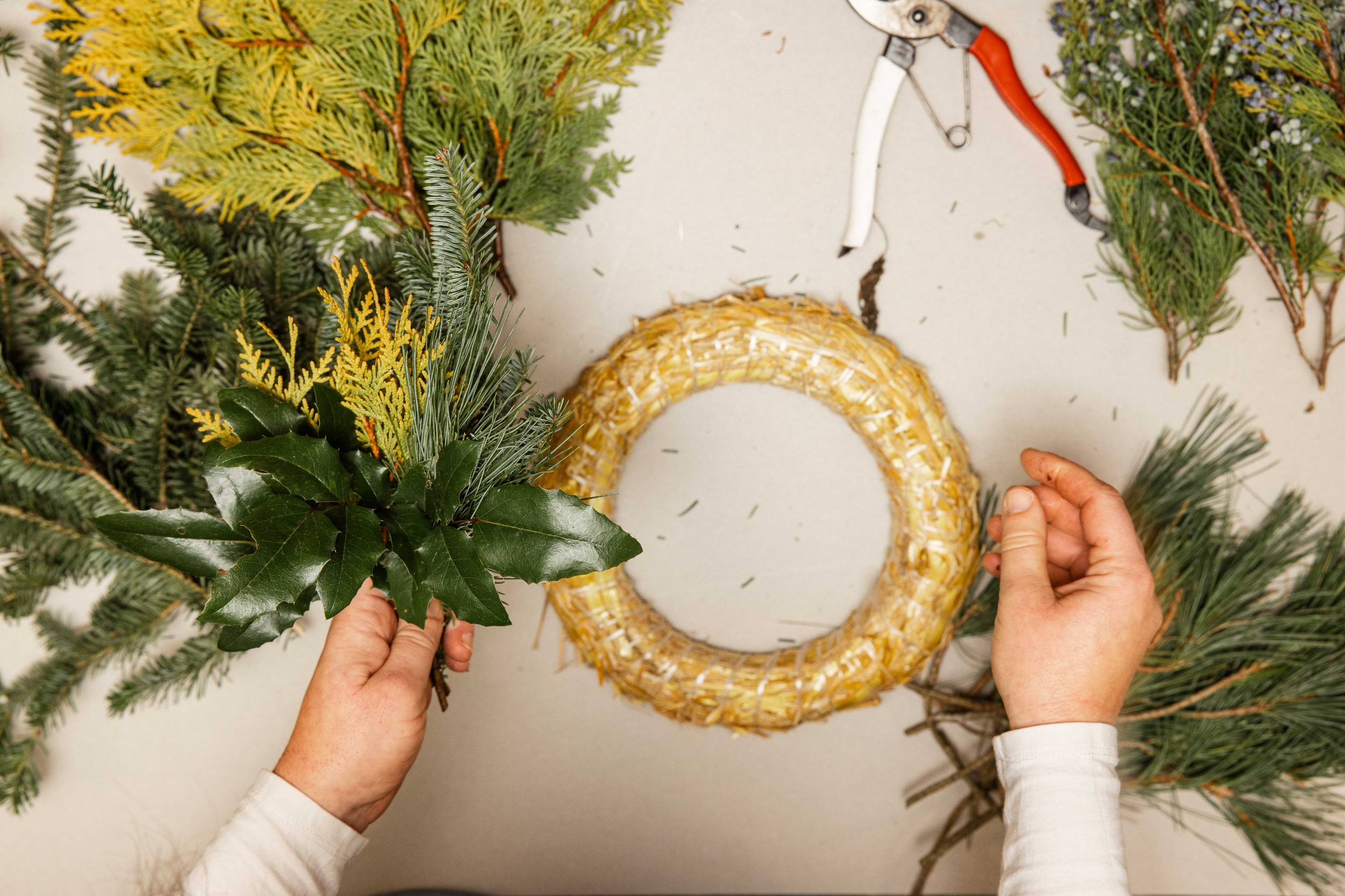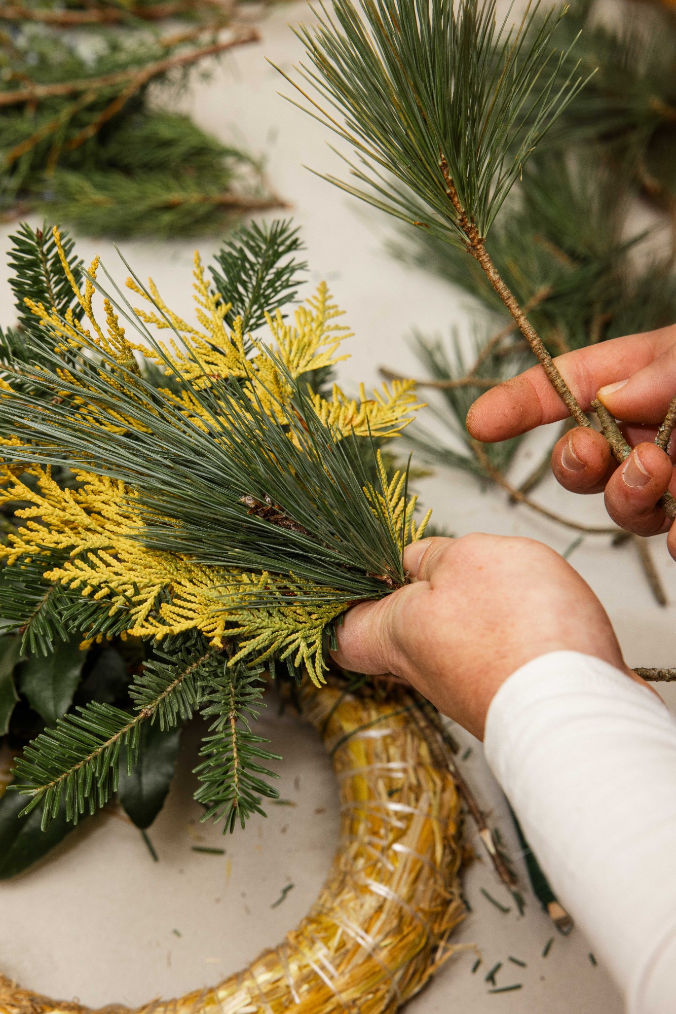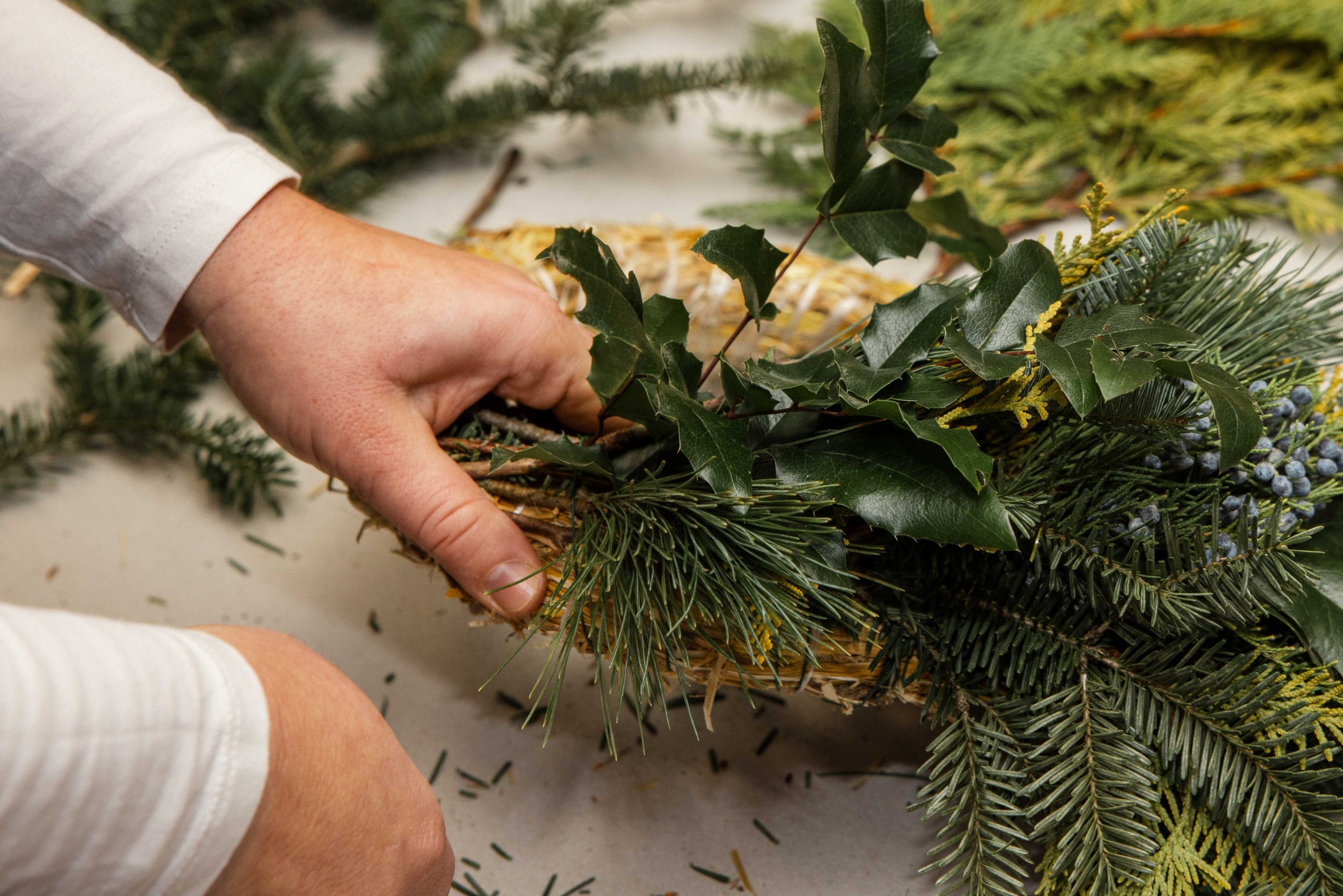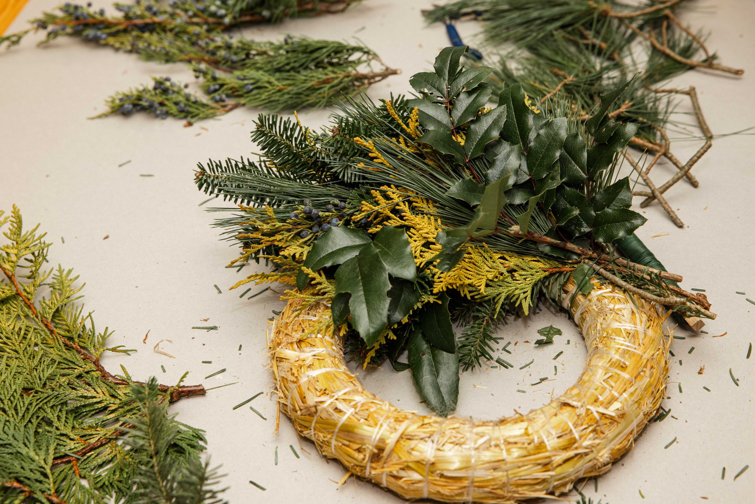 Izvēlētos zarus sagriež nepieciešamajā garumā. Zaru garums atkarīgs no tā, cik kuplu, spurainu vai kompaktu vēlamies adventes vainagu. Sagrieztos zarus sasien nelielās čupiņās.